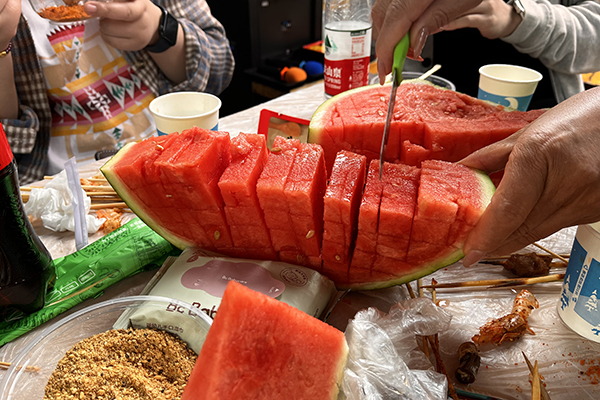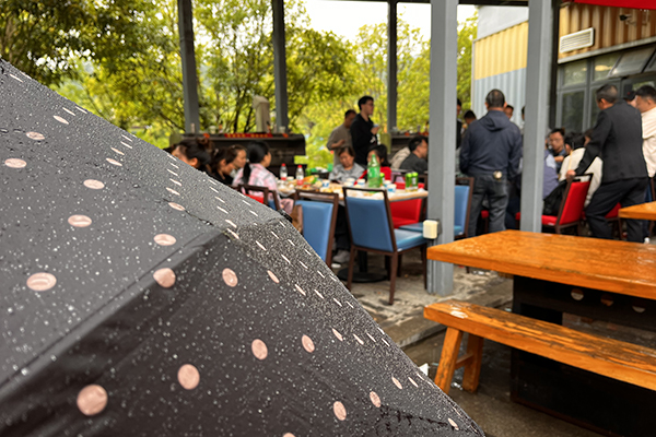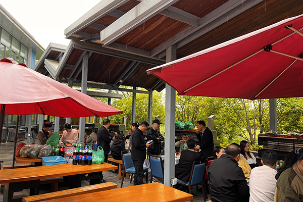 同事們圍坐在一起,分享著美食與歡笑。雨水打在樹葉上,發出沙沙的聲響,仿佛是大自然的和聲,為我們的聚會增添了幾分浪漫與詩意。雨水似乎也被我們的歡樂感染,輕輕地拍打著地面,仿佛在為我們鼓掌。
